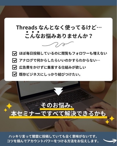 超初心者でもわかりやすくお伝えする「threadsに特化したセミナー」を初開催します。Wands3 2F 参加費:1000円(+ワンオーダー)13:00受付13:15 スタート。ご興味ある、参加希望の方はDMにて。