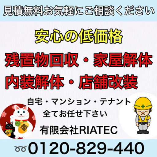 安心の低価格残置物回収・内装解体・改装・家屋解体工事自宅 マンション テナントお任せ下さい見積り無料!他社よりも安く見積りをあげます!お気軽にご相談下さい!内装解体・改装屋根瓦修繕家屋解体残留物の撤去解体工事が始まる前に、解体する店舗内に残されたままの家具や什器等を撤去お任せ下さい対応地域関西全域有限会社RIATEC-リアテック-奈良県橿原市東坊城町209-16代表 生川 0120-829-440 https://riatec.info