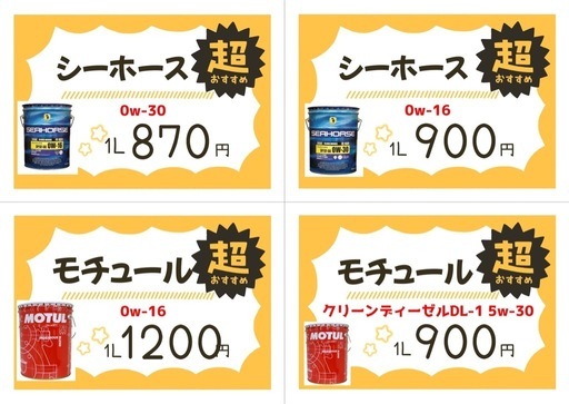 0w-16、0w-20、0w-30、5w-30、5w-401リットル700円〜になります。車種、年式、型式をお知らせ下さい。必要オイル量をお調べし、お見積もりを出させて頂きます。工賃は550円です。パッキン交換 120円エレメントはほとんどのお車が900円になります。希に違うお車がありますのでその際はお知らせ致します。趣味&副業ですのでこの価格でしています。個人で普通のシャッター付きガレージでしている為、待合室などはありません。お見積もり、ご相談はお気軽にお問い合わせ下さいm(_ _)mGoogle https://g.co/kgs/v3m6g8エキテン https://www.ekiten.jp/shop_45366176/menu/お店のミカタ https://ppdiy.on.omisenomikata.jp/HP https://quu79.crayonsite.net/#トヨタ#ホンダ#ニッサン#ダイハツ#スズキ#奈良#大阪#京都