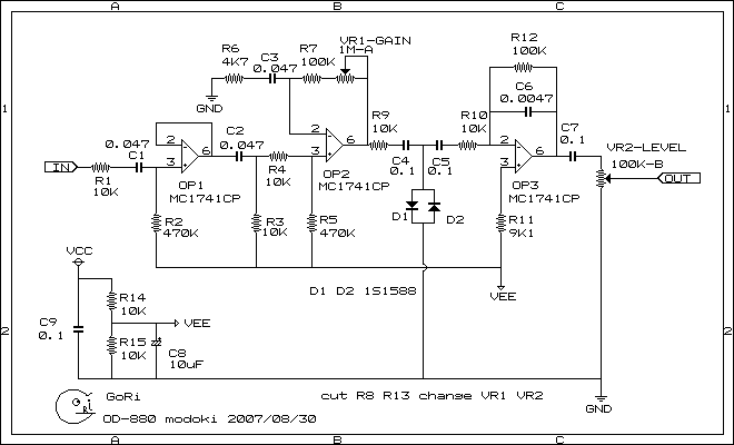 2007年に製作 もう廃番になったモトローラのシングルオペMC1741CP3個使用したシリコンダイオードクリッピングのオーバードライブです。 クリッピングの位置がディストーションです。 ゲインポットを倍の値にして歪みを増やし最終出力のボリュームの値を変えて大きくしてます。 回路図は http://www.inet-shibata.or.jp/~gori/info/infdata/121.png を参考にしてください。 なのでボリュームはフルテン厳禁です。 一応9VのAC/DCセンターマイナスが使えますがお間違えの無いように。 違うエフェクターでしたがLINE6のAC/ACアダプター入れられて焼かれた経験あります。 電源は電池推奨です。 そう私エフェクター製作してたgoriです。 音は https://www.youtube.com/watch?v=YD3X6ttgSP8 で動画が視れますがボケ動画ですが音はそれなりに録れてます。 これの製作の一部が http://www.inet-shibata.or.jp/~gori/info/inf.cgi?mode=main&cno=23 でみれます。 後半のバージョンはありませんのでよろしく。 これはプリント基板ではありません。 富裕のユニバーサル蛇の目基板です。 値段も高い危険なオーバードライブですが経験者に。 試奏してから決めてくださいね。 通販はしておりません。 欲しければ来てね。 ああ、これを作ってくださいはなしね。 これデジタルアンプには入れないでね。
