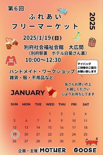 前回 沢山の方のご来場ありがとうございました関係者・出店者様もビックリしました次回の開催が決まりました皆様お誘い合わせの上ご来場ください😊2025/1/19(日)10:00〜12:30 雨天決行別府社会福祉会館 大広間 ハンドメイド・ワークショップ 雑貨・不用品・服等あります参加申し込み・お問い合わせ先0963penchan1503LINEにてお願い致します企画・主催 MOTHER GOOSE (マザー・グース) 年明け最初のフリーマーケット一緒に楽しみましょう 2月はお休みします次は3月の予定です⚠️3/16に決まりました 随時募集しております 宜しくお願い致します