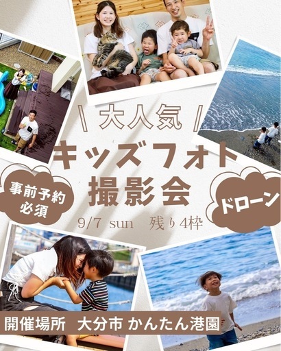 【 ドローン空撮&一眼レフ撮影会 in かんたん公園🌊 】海辺での特別撮影会を開催いたします。青く広がる空と海を背景に、ドローン撮影&一眼レフで美しい一瞬を残しませんか?👨👩👧👦ファミリーフォト🎂バースデーフォト🤰マタニティフォト💍ウェディング風フォト⛑️企業紹介PR撮影等👶キッズフォト(七五三等)🐶ペットと一緒の記念撮影 など、 なんでも、すべてOK!- - - - - - - - - - - - - - - - - - - - - - - - - -📅開催日2025年9月7日(日)📍場所かんたん公園(大分市)集合:カフェ・ナ・コスタ前※駐車場あり(お客様ご負担)- - - - - - - - - - - - - - - - - - - - - - - - - -🕒撮影枠(各枠1時間・先着順) 1. 9:00 〜 10:00 ❌ 2. 10:30〜11:30 ❌ 3. 12:00〜13:00 4. 13:30〜14:30 5. 15:00〜16:00 6. 16:30〜17:30- - - - - - - - - - - - - - - - - - - - - - - - - -💰料金ミスカット(目瞑り等)を抜いた最低80〜100カットデータお渡し※写真レタッチ、動画編集に2週間ほどお時間いただきます。ドローン空撮の動画付き(編集済)1組 20,000円(税込)※お支払いは【当日現金のみ】となります。- - - - - - - - - - - - - - - - - - - - - - - - - -📷衣装・持ち物・衣装はお客様ご自身でご用意ください・小物やおそろいコーデも大歓迎です!(シャボン玉等ちょっとした小物は用意させていただきます)・ペットとの撮影もOKです🐾- - - - - - - - - - - - - - - - - - - - - - - - - -☔雨天時・雨天時は【延期】となります。 事前にご連絡いたします。- - - - - - - - - - - - - - - - - - - - - - - - - -【 申込事項 】 1. 保護者のお名前・連絡先 2. お子様のお名前・年齢(該当の場合) 3. 希望日時(第3希望まで) ※「どの時間でもOK」も可 4. 希望の撮影プラン (例:マタニティ、七五三、家族、バースデー、ウェディング等) 5. 参加人数 6. SNS掲載の可否 (親子OK/子どものみOK/掲載不可など)- - - - - - - - - - - - - - - - - - - - - - - - - -【 注意事項 】・時間の枠が決められてますので、時間厳守でお願いいたします。・お友達との参加も可能ですが、その場合は代表者の方が2枠分お申し込みください。・最大2家族まで同時に対応可能です。・一般の方の往来がある公園での撮影となるため、他の方が写り込む可能性があります。ご了承ください。- - - - - - - - - - - - - - - - - - - - - - - - - -【キャンセルポリシー】・キャンセルされる場合は、前日までに必ずご連絡をお願いします。・**当日キャンセルや無断欠席はキャンセル料100%**を頂戴いたします。- - - - - - - - - - - - - - - - - - - - - - - - - -📞お問い合わせ・お申し込みsmile life aerial / photographer 植村TEL:090-7396-2423(受付担当 後藤) 097-507-5594(代表 岡邊)【Googleフォームでの回答】 https://forms.gle/CH1kTMVFFx34J6KT9ジモティー内、公式LINEまたはDMでもお気軽にどうぞ♪HP→ https://www.smilelifeaerial.com/LINE→ https://lin.ee/b5rUnc3insta→ @stl_sla_studio皆さまのご参加、心よりお待ちしております☺️🫶🚁#大分市イベント #撮影会 #ドローン空撮 #新築記念 #ドローンフォト #スマイルライフエアリアル #SLA #新築祝い #家族の思い出 #記念写真 #マイホーム記念 #大分フォト #無料撮影モデル募集 #新サービス開始 #ドローン撮影 #ドローン空撮 #大分フォトグラファー #大分カメラマン #家族フォト #マタニティフォト #家族写真 #ファミリーフォト #空撮フォト #大分フォト #思い出づくり #smilelifeaerial #ウェディングフォト #新築記念フォト #イベントフォト #ギッズフォト #大分市撮影会 #人生の節目を空から撮影 #ドローンパイロット #撮影イベント大分