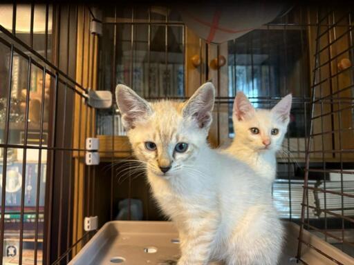 ◆性格や特徴地域猫の未避妊のママ猫から、生まれました。(ママ猫避妊済み)2匹とも中毛~長毛で、フワフワの手触りがぬいぐるみのようです。【白猫の女の子】大人しいですが、意外と活発、鳴き声がとても可愛いです。頭から尻尾まで、白くて美人猫。耳は、裏表とも、ピンク色です。【シャムトラの男の子】大人しく、ちょっと警戒心が強めですが、甘えん坊になりそうです。キレイなブルーアイがとても凛凛しいです。優しい性格です。◆健康状態・白血病、エイズ陰性(7/2時点)・ノミダニ駆除済み(フロントライン)・お腹の回虫駆除済み(ドロンタール)・ワクチン1回目接種(7/5)【2回目は7/30前後】・カリカリも食べられます。・トイレもバッチリです。・人にも、慣れています。◆その他一匹ずつの譲渡でも、構いません😊ただ、仲良しなので、2匹一緒に里親になってくれると嬉しいです。🔸ペット可のお住まいで、完全室内飼い、脱走対策をお願いいたします〈ご自宅を訪問させていただきます。)🔸単身者、20歳以下、65歳以上 の方は後見人が必要です。🔸避妊手術、ワクチンを含め、必要な医療をお願いします🔸ご自宅を訪問させてください。最期の時まで、愛情と責任持って、この子(たち)を幸せにしてあげたいと思われた方のお問い合わせ、お待ちしています。飼い主不在、確認済みです。
