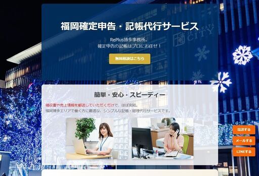 確定申告についてお困りごとは当社にお任せください!個人に任せて、領収書などが返ってこない等のトラブルでご相談いただくこともございます。当社は、福岡県発の事務・経理代行の法人になります。郵送・LINEで他県にもスムーズ対応可能です★当社の特徴基本的に丸投げOK!料金はシンプルな定額制個人事業 月8,800円法人 月11,000円決算月のみ一律 33,000円※100仕訳以上は、50仕訳毎に半月分頂戴しております。※決算書作成のみにも対応しております。更にお得にお客様を別に1名ご紹介頂く毎に月額1割引き。最大10名様ご紹介頂くことで、月額無料にできます!勿論、青色申告65万円控除にも対応しています!やり取りは、溜まった領収書をまとめてご郵送いただくだけ。もしくは、お客様がご契約中の会計ソフトにログインさせて頂ければ、オンライン支援も可能。最終的に決算書(貸借対照表や損益計算書など)を作成し、郵送もしくはデータ送付いたします。お預かりした領収書類などはファイリングしてお返しいたします。税務事務所だと、年間30万円以上になるとお聞きします。当社の記帳代行はその半額程度で年間分を処理いたします。LINEはこちら https://lin.ee/XP9TGoS詳しくはこちら https://miya.replus-keiri.com/