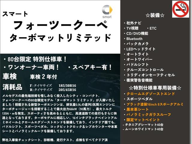 スマート スマートフォーツークーペ ターボ マット リミテッド ワンオーナー・ガラスルーフ・社外ナビ・フルセグTV・スペアキー・黒本革・バックカメラ・Bluetooth・クルーズコントロール・オートライト・オートワイパー・16インチアルミ・アイドリングストップ (車検整備付) (投稿ID : g_700100252930251110007)