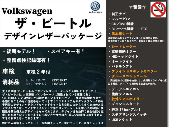 フォルクスワーゲン ザ・ビートル デザインレザーパッケージ 後期モデル・黒本革・シートヒーター・ボディ同色インパネ社外リアスポイラー・純正メモリーナビ・クルーズコントロール・ブラインドスポットモニター・プッシュスタート・フルセグTV・Bluetooth・ETC (車検整備付) (投稿ID : g_700100252930251113001)