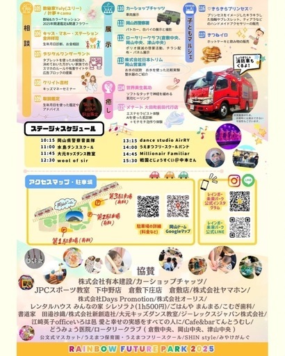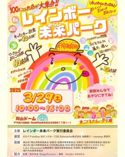 ↓こども達のやりたいが叶う✨@rainbow_mirai_park \レインボー未来パークとは?/子供達が主役となるイベントとなります♪やってみたいことを実体験することを通して、創造力や夢・世界観を広げ、世界に羽ばたいて行ける大人になるきっかけ作りとともに、家族で一日楽しめるテーマパークとなっております☺️✨113店舗以上のお店が集合✨▶︎キッチンカー・飲食▶︎ワークショップ・お仕事体験▶︎ハンドメイドや物販▶︎スポーツ体験▶︎美容・健康▶︎展示・相談系▶︎こどもマルシェ✨ステージもあるよ✨イベントを盛り上げてくれる演出者さん達がたくさん♪《レインボー未来パーク~こども達に夢を~》3月29日(土) 10時〜16時岡山ドームにて開催