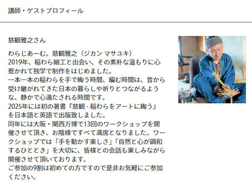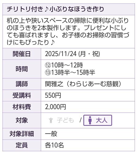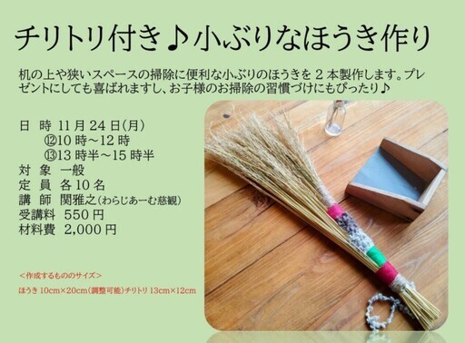 机の上や狭いスペースの掃除に便利な小ぶりのほうきを2本製作します。プレゼントにしても喜ばれますし、お子様のお掃除の習慣づけにもぴったり♪開催日 2025/11/24 (月・祝)時間 ⑫10時~12時講師 わらじあーむ。慈観雅之受講料 550円材料費 2,000円対象 子ども / 大人対象詳細 一般定員 各10名講師・ゲストプロフィールわらじあーむ。慈観雅之(ジカン マサユキ) https://www.instagram.com/jikann_masayuki/2019年、稲わら細工と出会い、その素朴な温もりに心惹かれて独学で制作をはじめました。一本一本の稲わらを手で綯う時間、編む時間は、昔から受け継がれてきた日本の暮らしや祈りとつながるような、静かで心満たされる時間です。2025年には初の著書『慈観 - 稲わらをアートに綯う』を日本語と英語で出版致しました。同年には大阪・関西万博で13回のワークショップを開催させて頂き、お陰様ですべて満席となりました。ワークショップでは「手を動かす楽しさ」「自然と心が調和するひととき」を大切に、皆様との会話も楽しみながら開催させて頂いております。ご参加の9割は初めての方ですので是非お気軽にご参加ください^^申し込み方法は次の2つです。①往復はがき②交流センター窓口※倉敷市玉島市民センターは倉敷市内・市外の方を問わず 対象にしています。※詳しくは交流センターのホームページをご確認ください。 https://www.tamashima-cec.jp/cec-workshops/