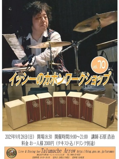 【明日開催!津山でカホン!!!〜津山、県北エリアのみなさま、お気軽にどうぞー!😄🎶】〜「イッシーのカホンワークショップ津山編」は明日9月28日開催です〜 https://www.facebook.com/share/1Fx9k2BDDv/?mibextid=wwXIfr いつものように初めての方、まだカホンをお持ちでない方、お出かけなどで持ち歩けない方にはレンタル用カホン(※無料・要予約)もご用意してます! 少し多めに準備してますので、カホンお持ちでない方の飛び込み参加にも対応できますのでお気軽にご参加ください。 70回目だからというわけではありませんが、今回の特典⁉︎として現在倉敷と岡山で大好評の、カホンをマイキングしてそれぞれのプレイを生音と音響機器を通しての音とを聴き比べながら音色と自身の奏法を考察するコーナーを今回津山でも設けてみたいと思います😊☝️ マイカホンご持参の方は、ご自身のカホンの音色、そして一番いい音を知るべくいい機会です😊ぜひお試しを!😄☝️🎶 初心者の方には一からフォームと奏法をていねいにレクチャーいたしますし、これまでご参加の方、演奏されてる方はいま一度、ご自身の楽器のポテンシャルを高めるべく奏法や楽曲へのアレンジ、アプローチ、様々な音楽スタイル、リズムパターンのグルーヴまでも観点を拡げていただけたらと思います😊👍 カホンから音楽を演奏する、合奏する楽しさをぜひ一緒に体感しましょう!!!😄🎶【イッシーのカホンワークショップ津山編Vol.70】 https://www.facebook.com/share/1Fx9k2BDDv/?mibextid=wwXIfr★2025年9月28日(日)★■開場:18:30■開催:19:00■料金:お一人様2,000円(ドリンク別)★カホンをお持ちでない方には無料でカホンをレンタルしております(要予約)🎶※ご参加お申し込みの際にレンタルご希望の旨も合わせてお願いいたします☺️🙏■会場:Live&Dining bar【 Talumache Arrow 】 津山市戸川町49 ペントハウスビル2F ☎️ 0868-32-9322■会場:Live&Dining bar【 Talumache Arrow 】 津山市戸川町49 ペントハウスビル2F ☎️ 0868-32-9322■お申し込み・お問い合わせ:Facebookイベントページ( https://www.facebook.com/share/1Fx9k2BDDv/?mibextid=wwXIfr )から"参加予定"をクリックしていただくか、または下記の連絡先、SNSのメールなどにてご連絡下さい。◆タルマッシュアロー☎️ 0868-32-9322◆石原☎️090-6012-7667📧jico.drums0723@gmail.com★Instagram:ユーザーネーム jicodrums ★LINE ID:jicodrums0723#カホン#Cajón#イッシーのカホンワークショップ#津山編は9月28日日曜日開催#津山TalumacheArrow#岡山編は10月15日水曜日開催#MOGLAYoSo#倉敷編は10月30日木曜日開催#クッキージャー#HAKOFES#ハコフェス#カホンの祭典