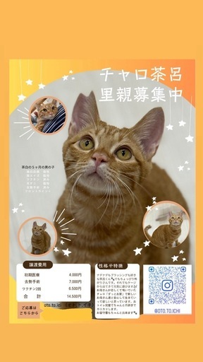 ◆性格や特徴茶トラの茶呂(ちゃろ)くんです。撫でてもらうのも、ブラッシングも大好きチャロくん♥お膝に乗せると人の腕に顔をうずめて、じっと撫でられているような子です。朝は必ずナデナデしてーと催促♪はじめはお母さんから離されて、寂しくてずっと鳴いていましたが、今では兄弟と元気に走り回っています。先住猫達とも上手く付き合えています。少しでも早く「本当のお母さん」になってくれるご家族と暮らし、もっと甘えたいはず…。ご飯もしっかり食べて、おトイレも失敗はないお利口さんな子です。2025.6.10生まれなのでフルタイムのお仕事でも1人でお留守番が出来ます。◆健康状態良好です。駆虫済(レボリューションプラス)検便(数回)済みワクチン2回目済み(次回1年後)猫エイズ、猫白血病検査 両方陰性猫風邪も目ヤニもなく健康ですカリカリを食べていますおトイレも完璧です◆その他く引き渡し場所 >→譲渡先のご自宅まずお見合いを譲渡先のご自宅にてさせて頂きます。その後、お迎えのご準備が整いましたら、トライアルをスタートさせて頂きます。(こちらからお伺いし、環境確認を必ず行った上でトライアルに進みます。<譲渡条件について>・完全室内飼い・玄関や窓などの脱走防止対策を必ずお願いしています・毎年のワクチンと避妊去勢手術実施・避妊去勢手術報告書提出・ペット可の住宅にお住まいであること・家族全員の同意があること・家族に猫アレルギーのないこと・心身ともに、子猫のお世話ができる状態であること・猫を飼うにあたって安定した収入のあること・飼っている犬猫の避妊去勢手術を済ませていること・飼っている猫も完全室内飼いであること・ハーネスをつけてのお散歩やベランダやお庭へ出すことはしないこと・長時間ゲージで飼わないこと・お留守番や安心できる場所を確保するためケージ2~3段(手作りは不可)をお願いしております。(物品はトライアル決定日以降に揃えてください)以上の条件で問題ない場合でも、飼育環境等によってはお断りする場合もあります。当方と、誓約書を交わしていただき、ご本人確認(身分証・郵便物等)をさせていただいております。お一人暮らし、同棲の方はご遠慮ねがいます。(ご相談はお受けしております)未成年の方からの応募は受け付けられません。高齢の方だけのご家族の場合、後見人をお願いしております。《譲渡費用》ワクチン接種 6,500 円初回検査費用 4,000 円去勢/避妊手術 7,000 円合計金額 17,500 円※譲渡日までに病院にかかった場合には医療費が加算されます。