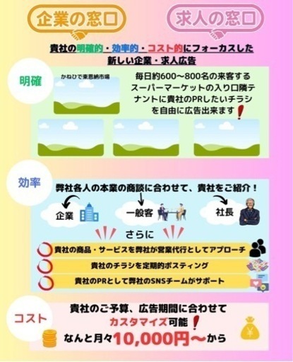 \掲載企業様、個人事業主様を先行大募集中/最後まで読んで頂ければチラシを置くスペースを提供するだけでは無いことがきっと分かって頂けます。【店舗の外観について】外観はこれから改装して"企業の窓口"という看板を設置予定です。【料金プラン】月額1万円→年間12万円(税抜)の広告掲載のスペースを2023年8月1日にオープンします!あなたの会社を沖縄の有名スーパーの横で宣伝しませんか?●広告掲載費は年間いくらかけていますか?●自社を宣伝する為のチラシはお持ちですか?●1日800〜1000名が店舗の前を通ります。●定期的なポスティング、営業代行、SNS添削が含まれています。●チラシ作成は別途料金で作成可能です。