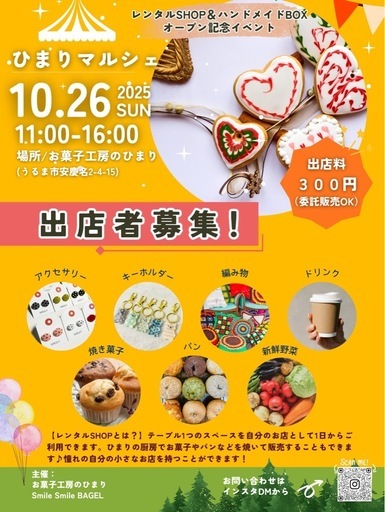 「レンタルSHOP」「ハンドメイドBOX」のオープンを記念して、お菓子工房のひまり店内で、『ひまりマルシェ』を開催します!★出店者さん大募集★※委託販売OK!日時:10/26(日) 11:00〜16:00出店料:300円テーブル、イスはこちらでご用意します!↓販売スペース①80×80cmのテーブル②90×60cmのアウトドアテーブル③160×80cmのアウトドアテーブルの半分※ご選択はできません。お申込みの店舗数、販売商品などで決定いたします。・共同出店OK(店番2名まで)・委託販売OK(商品を納品していただくだけでOK!販売はこちらで行います)マルシェへのお申し込み・お問い合わせ、また「レンタルSHOP」「ハンドメイドBOX」へのお問い合わせなどはインスタのDMでお願いします✨インスタ@himari_rental