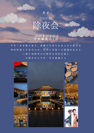 識名園向いにある浄土真宗のお寺。琉球識名院では毎年12月31日に今年一年を振り返り、感謝の気持ちを表す大晦日の法要除夜会(じょやえ)を執り行っています樹齢千年の檜の木を使用した本堂で今年一年の締めくくりとして阿弥陀様に感謝の気持ちを伝えませんか除夜会(法要)の後は、500個のキャンドルの灯とともに二胡と琉球琴の演奏がありますどなたでも自由に参加できますぜひ、2025年の最後を琉球識名院でお参りください16:30 除夜会(大晦日の法要)18:00 灯明流し灯明が終わり次第、二胡と琉球琴の演奏があります20:00 閉院※年末年始の御朱印は、除夜会より配布いたします※灯明流しの時間は状況によって若干時間が前後する可能性があります※ご参拝は朝9:30から可能です【灯明流し】は故人様への感謝の気持ちを添えて、僧侶の読経とともに灯明を本堂前の水盤に浮かせますご希望の方は事前予約が必要です 灯明お布施3,000円☆☆【年始の参拝について】☆☆10:00 修正会(しゅしょうえ)修正会とは、仏前で前年の行いを悔い改め、身を正した後に新しい年が健やかであるよう、新年のはじめに行う法要です※新年を迎えた1月1日から1月3日は、朝7時から開院しています※本堂では、温かい甘酒の振る舞いと御朱印を配布いたしますどなたでも自由にお参りできますのでぜひ足をお運びください♪