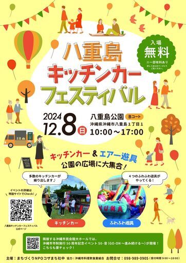 12月08日は沖縄市の八重島公園に遊びに行こう!「八重島キッチンカーフェスティバル」では8台のキッチンカー&4つのエアー遊具が公園の広場にやってきます。会場内にはテーブル・イスも設けるので、そこで食事を楽しむも良し。レジャーシートを持ってきて、ピクニック気分で楽しむも良し。肩ひじ張らずに、ゆったりとお過ごしください。また、当日は隣接する沖縄市民会館大ホールにて「50-音(GO-ON~進み続ける~)」が開催されます(要整理券)。こちらもあわせて楽しむのもいいかも!ぜひぜひ遊びに来て下さい~。【八重島キッチンカーフェスティバル】日時:2024年12月08日(日)10時00分~17時00分会場:八重島公園Bコート住所:沖縄県沖縄市八重島1丁目1入場:無料(キッチンカーでの購入、エアー遊具の利用は有料)詳細: https://kozamachi-magazine.com/lp/yaeshimapark-kitchencar-festival/【出店キッチンカー】No.01|ステーキハウスOKNo.02|パナマ原人No.03|passoNo.04|田島屋No.05|サカエカンパニーNo.06|LuckNo.07|コザタコスNo.08|ドコデモタコス【エアー遊具】・アニマルランチ・シーワールド・シロクマスライダー・ビッグカフーナ