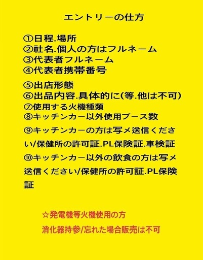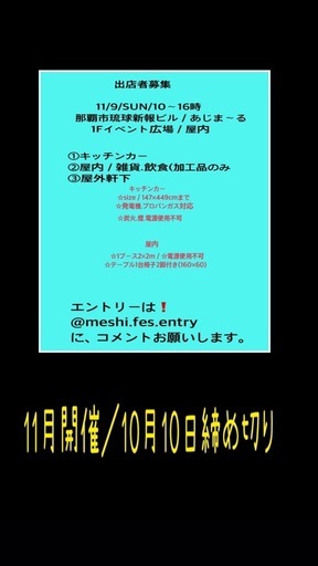 屋外/キャンセル待ち屋内/4ブース→3ブース11/9日/10〜16時那覇市琉球新報ビル1F悪天候中止搬入時間/9時〜10時〜募集要項〜①キッチンカー/サイズ制限有り(149×339cmまで)幅.長さ②軒下/キッチンカー以外 2×2m.....テント不用.テーブル等 の備品持参③屋内/テーブル1台椅子2脚付き必要な備品持参(2×2m)〜注意⚠️〜炭火、煙の調理加工不可キッチンカー以外の方は、車を路駐または、コインパーキングに停めて商品等を手持ちで搬入、出してください。パーキング代実費。電源使用不可。途中搬出不可〜キャンセル〜エントリー完了、出店確定後、自己都合でキャンセルした場合、キャンセル料100%です。また、開催中止する場合、キャンセルした方に返金は有りません。*エントリーは❗️@meshi.fesに、DMお願いします