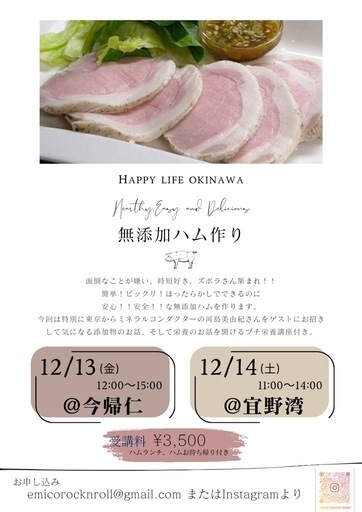 面倒なことが嫌い、時短好き、ズボラさん集まれ!!簡単!ビックリ!ほったらかしでできるのに安心!!安全!!な無添加ハムを作ります。12/13(金) 12:00-15:00作ったハム500g弱お持ち帰り、ハムランチ、レシピ付き。受講料3500円今回は特別ゲスト✨東京からミネラルコンダクターの河島美由紀さんをゲストにお招きして、気になる添加物のお話、そして栄養のお話を聞けるプチ栄養講座付きです。※当日キャンセルは材料費を頂戴しております。