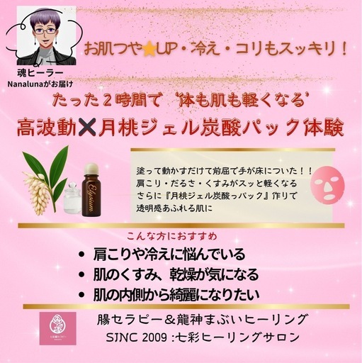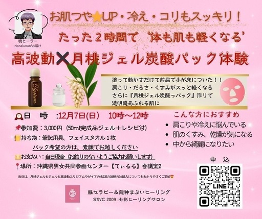 たった2時間で“体も肌も軽くなる”塗って動かすだけで「前屈で手が床についた!」人続出✨肩こり・だるさ・くすみがスッと軽くなる🌿さらに【月桃ジェル炭酸パックづくり】も体験💆♀️透明感あふれるツヤ肌を実感できます✨お持ち帰り用 月桃ジェル50ml付き🎁自然の力と高波動のエネルギーで、心も体もふんわり整う癒しのワークショップ🌿沖縄生まれの植物「月桃」を使った特製ジェルで、肩や首のこりがスッと軽くなり、お肌のくすみ・乾燥をケアして透明感がアップ✨✅ 肩こりや冷えに悩んでいる✅ 肌のくすみ・乾燥が気になる✅ エステに行く時間がない✅ 癒されながらキレイになりたい📅 日時:11月15日(土)10:00〜12:00📍 会場:沖縄県男女共同参画センター【てぃるる】研修室2(那覇市西3-11-1)💰 参加費:3,000円(お釣りのないように)🎁 月桃ジェル50mlお土産つき筆記用具・ハンドタオル・フェイスタオル※炭酸パック希望の方は素顔でお越しください💆♀️七彩公式LINEに「ジェルワーク希望」と送信✨👉 https://lin.ee/ddEi79mあなたの“内側の巡り”が整うと、肌も心も輝き出します🌿月桃と高波動のちからで、疲れもくすみも手放し、ふんわり笑顔のあなたへ🌸当日は、月桃ジェルと高波動エリジアムやガイアの水135の波動のしくみについてもわかりやすくご紹介します。