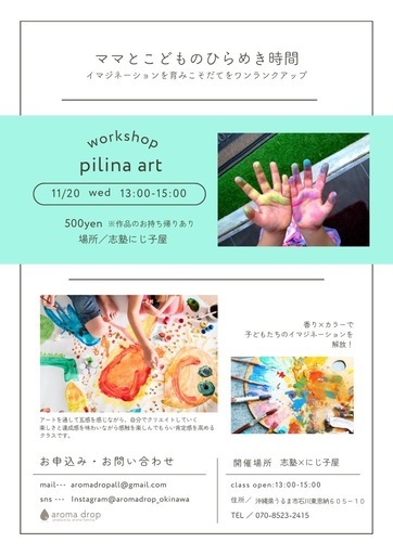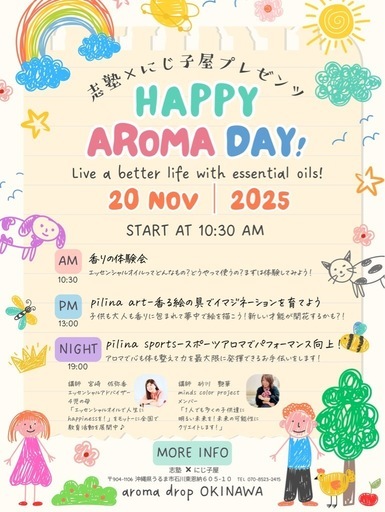 志塾フリースクール×にじ子屋プレゼンツワークショップ②aroma drop Okinawaとのコラボワークショップです🎵pilina art沖縄初開催✨エッセンシャルを加えた絵の具でイマジネーションを広げ大人も子供も夢中で描きましょう🎵優しい香りとの化学反応が唯一無二の作品になります!どなたでも参加できます!フリースクールやデイサービスなどの参考にもなると思います!スタッフの方の参加も大歓迎です!天然の植物から抽出された安心安全のdoTERRAのエッセンシャルオイルを採用しています!参加ご希望の方はDMください✨19日~21日6つのワークショップを開催します!うるま市開催ワークショップpilina Sports ピリナスポーツ香りの体験会こちらもチェックお願いします!那覇市開催のワークショップも合わせてチェックお願いします!