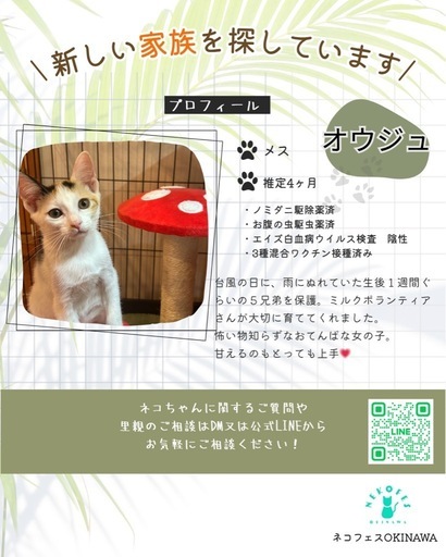 ◆性格や特徴怖いもの知らずのおてんばな女の子甘えるのもとっても上手♡◆健康状態良好ですノミダニ駆除薬済みお腹の虫駆虫薬済みエイズ白血病ウイルス検査陰性ワクチン2回接種済み◆その他台風の日に、雨に濡れた生後1週間くらいの5兄妹を保護し、今までミルクボランティアさんがミルクから大切に育ててくださいました🍼譲渡にあたり、お約束事がございます・脱走防止に努め、脱走対策に取り組んでいただける方・時期が来ましたら不妊手術をしていただける方・必要な医療にかけてくださる方・最後の時まで家族として愛情を注いでいただける方11/22(土)ネコフェス譲渡会に参加します宜野湾市嘉数インスタグラム @nekofesokinawa是非一度会いに来て下さい♪(当日連れて帰ることは出来ませんのでご了承下さい)お問い合わせお待ちしております《飼い主不在確認済み》