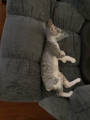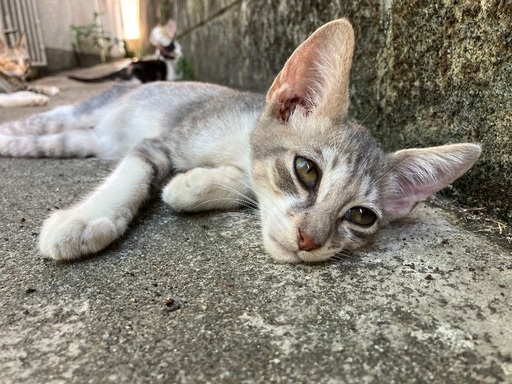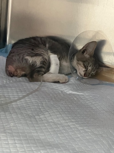◆現在に至る経緯&性格や特徴この子のお母さんは、8月の終わりに事故にあい亡くなりました。推定誕生日は、6月15日です。現在1.4kg(9月21日に動物病院にて測定)現在3ヶ月を過ぎたオスです!お母さんネコが亡くなる前に離乳出来ました。発育が良く活発になっています。脚力もついてきました。動物病院での血液検査で問題なし。猫HIV、猫白血病はともに陰性です。動物病院にて、爪切り、耳掃除、ノミ・ダニ薬投与、1回目のワクチン接種(9月22日)済み。9月21日昼に、命に関わる大怪我を負いながらも、自力で戻って来ました。その日のうち緊急手術を受け、重篤な感染症を防ぐ目的で、獣医さんの判断で尻尾を根本から切断する事となりました。後遺症はないです。背中に5cmに渡る深い裂傷と、顎の下に3cmの深い裂傷があった為、縫合する必要がありました。運良く骨折はなく、元気になりました。抜糸日が9月29日で、それまでには現在飲んでいる薬も終わります。去勢手術が出来る年齢に達していないので、今回は地域ネコになる為の手術は出来ませんでした。室内飼いをして下さる方を探しています。対面&触れ合い希望の方、ご質問のある方は、お気軽にメッセージをください。宜しくお願いします🐾人懐っこいです!◆健康状態食欲旺盛缶詰もドライフードもちゅーるも大好き❤目やになし&口臭なし飼主不在確認済み