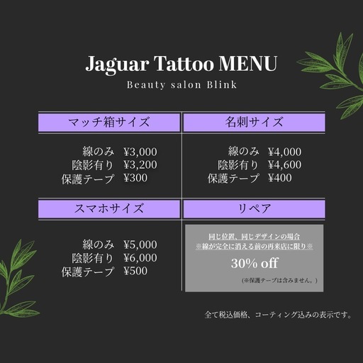 はじめまして!Beauty salon Blinkです🪻恩納村で自宅サロンをしています😊もうすぐ冬休み、、という事でオススメしたい地元の方だけではなく観光客の方にも人気のジャグアタトゥー🖤⋆͛*͛なんと、、18歳未満でも、お子様でも施術可能😳❕(※未成年の方は保護者の同意が必要です。)┈┈┈┈┈┈┈┈┈┈┈┈┈┈┈┈┈┈┈┈┈┈┈┈┈- ジャグアタトゥーとは? 約2週間で消えるフェイクタトゥーです🙌 「ゲニパアメリカーナ」という南米のフルーツを 主原料とする染料を使用して肌に着色します🫐 分かりやすいものでいうと ナスDが全身に塗って黒くなっていた "あれ"と同じです🤣🍆 ジャグアタトゥーは 本物のタトゥーとは違い、痛くありません!! 肌に染料でデザインを描き🖊 放置時間のあと洗い流して💧 徐々に発色していき😐 徐々に消えていきます🫥 色味は濃いネイビーで本物のタトゥーにそっくりで ボディーアートの一種としてお楽しみ頂けるので 年齢制限もございません!🆓🌈 長期休みやイベント時の期間限定で...! タトゥー前のイメージとして...! 本物のタトゥーの代わりに長期的に...! 旅の思い出に記念として...! 友達やカップル、家族とお揃いに...! それぞれの楽しみ方を見つけてみてください🎶┈┈┈┈┈┈┈┈┈┈┈┈┈┈┈┈┈┈┈┈┈┈┈┈┈そしてもちろん、、マツエク・まつパも大歓迎😆💫(こっちがメインメニューではある笑)ご予約、お問い合わせはインスタDM・LINEからお待ちしております😆🙌Instagram: https://www.instagram.com/_eyenerakLINE: https://lin.ee/8KOtzRfよろしくお願いいたします🙇🏻♀️┈┈┈┈┈┈┈┈┈┈┈┈┈┈┈┈┈┈┈┈┈┈┈┈【Beauty salon Blink】恩納村字瀬良垣 -ハイアット近く-(※予約確定後に住所伝えてます。)営業時間:月木金15:00~17:00 火 9:00~17:00 土 9:00~16:00定休日 :水日アクセス:🚏瀬良垣ビーチ前より 徒歩3分