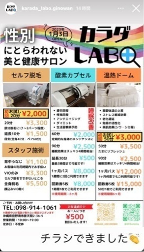 お疲れ様です!1月からなんと普天間でセルフ脱毛が出来るサロンが出来ましたー!!男性も女性もご利用出来る場所となってます!僕も髭🥸や身体の毛を今年は脱毛しようと思ってるので髭とか悩んでる男性の皆さんは是非とも来て欲しいです!