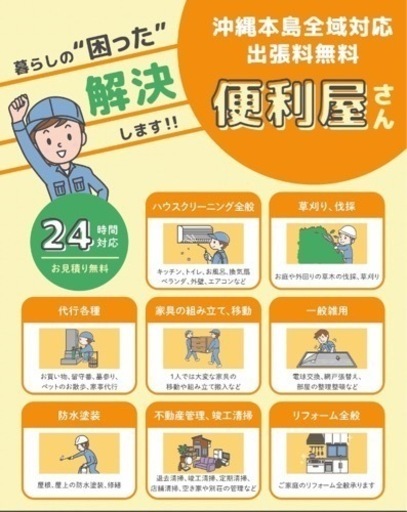 こんにちは❗️この投稿をご覧いただきありがとうございます。沖縄本島で活動している便利屋琉千です☺️インスタグラム https://instagram.com/benriya_ryusen?igshid=YmMyMTA2M2Y=琉千では、ご自宅、事務所、空き地などの草刈り、伐採も承っております。木一本から対応しておりますのでお気軽にお問合せください。メッセージのやりとりにて大まかなお見積もりもお出しします。琉千では、電球交換やお買い物など簡単なお仕事からリフォームまで幅広く対応しております🎵女性スタッフ同行も可能です。お気軽にお申し付け下さい。お見積りは無料で本島全域対応致します。〜〜〜〜〜〜〜〜〜〜〜〜〜〜〜〜〜〜〜〜沖縄の便利屋さん 琉千【サービス内容 一部】『ハウスクリーニング』・キッチンクリーニング(レンジフード、水回り、ガスコンロ等) ¥8,000〜・キッチン周辺クリーニング (電子レンジ、冷蔵庫等)¥5,000~・浴槽クリーニング(水垢、カビ、石鹸カス、排水溝、鏡磨き、換気扇) ¥8,000~・トイレクリーニング (便器、便器周り、換気扇) ¥8,000~・お風呂、洗面所クリーニング ¥8,000~・エアコンクリーニング ¥8,000~・ベランダ清掃 (高圧洗浄可能) ¥8,000~・駐車場、外壁などの高圧洗浄 ¥10,000~・ソファークリーニング(業務用リンサー使用) ¥10,000~『オフィス、店舗向けサービス』・グリストラップ清掃 ¥8,000~・ガラス清掃、サッシ清掃 ¥8000~・ポリッシャーフロア清掃 ワックス塗布・空き家、別荘の管理や清掃・竣工清掃、定期清掃・欠員補充『リフォーム、修繕』・リフォーム全般・防水断熱塗装 1平米/¥3,800~その他業務・草むしり、草刈り 坪/¥1,000~・庭木の剪定、枯葉回収 ¥5,000~・引っ越し、家具の組み立て、搬入、搬出 ¥5,000~・お部屋の整理整頓 ¥3,000~・代行各種(お買い物、家事、ペットお散歩、代理出席等)・カーシートクリーニング (業務用リンサー使用、オゾン脱臭可能) ¥12,000~・遺品整理 ¥5,000~・物置解体 ¥10,000~・簡易作業(電球交換、網戸張り替え、害虫駆除、カーテンレール取り付け、手すり取り付け、家具固定)¥1,500~上記料金は、作業内容や広さにより変動しますので予めご了承ください。まとめてのご依頼で割引など柔軟に対応いたします。まずはお気軽にご連絡ください。ハウスサポート 琉千住所 沖縄県うるま市石川2110-2-205電話 080-1390-1277 『24時間対応』年中無休