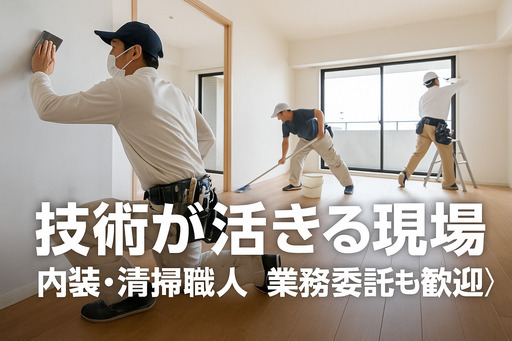 業務委託できる方大歓迎経験者にはさらに優遇制度あり!室内清掃から原状回復内装工事まで、一貫して対応できる職人の育成を支援します。※長期的なキャリア形成を目的として、若年層の方を主な対象としています。 https://kanemasa-tatemono.com/job-offer/★応募は必ず弊社ホームページの求人募集ページから応募ください。 (電話での受付は出来ません。) https://kanemasahome.grupo.jp/free2488038引っ越し等に伴う室内清掃・原状回復内装仕上げ・クロス貼替え・床貼替え等の仕事
