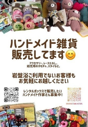 ハンドメイド雑貨を販売したい作家さんを募集しています!応募条件・直接ご来店できる方(郵送、振込対応は不可)・法律上問題のないこと(化粧品や食品など許可が必要なものは取得必須。)ご希望の方,気軽にお問い合わせください。事前下見も大歓迎です。Instagramに色々な情報発信しています。@marinetown.hotspa@handmade_yonabaru 定休日水曜日、旧盆、年末年始