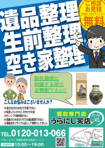 買取専門店うらにし笑店では金・プラチナなどの貴金属、ブランド品、時計の買取を行っております。その他にも外国のお金、商品券、切手、テレカ、カメラ、骨董品など、多くの品物の買取を行っております。店頭でのお買取りから、ご自宅へお伺いする出張買取、離島の方へは品物を郵送して頂く郵送買取なども行っております。どの査定でも査定料は頂いておりません。ご自宅にご不要なものが御座いましたら是非お気軽にお問合せください。※大型の家具などはお買取りする事ができません。