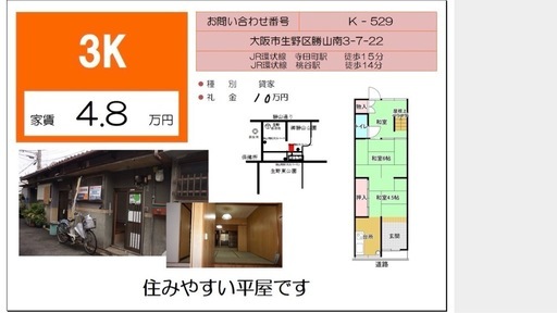 ●お住まい・事務所・店舗等としてのご利用に❗️●お仕事・お商売での、在庫や工具の置き場所に❗️ ●季節物の家具や家電・洋服の置き場所に❗️ ●リフォームや引っ越しの際の、一時的な荷物の置き場所に❗️ ●冬用タイヤ・バーベキューセット・スキー用品等の保管場所に❗️●電気、ガス、水道使用可❗️●トイレあり❗️ ・3K、平屋!・南向き!・建物前面道路は、アスファルト舗装済み!・2階、屋根上に上がる階段あり!・オーナー直接契約で、仲介手数料0円!(ご利用開始後の対応は、プロの管理会社にて行いますのでご安心下さい。) ・更新料0円! ・24時間365日荷物の出し入れOK! ・広さ約34.3㎡(約10.4坪・約20畳)! (賃料48,000円/月)・駅徒歩15分圏内!(JR環状線桃谷駅)・バス停徒歩約3分(大阪シティバス・生野区役所バス停)・施設見学OK! ・個人様、個人事業主様、法人様ともにご利用OK! ・すぐお近くに、同一オーナーの月極駐車場あり!(15,000円〜/月)・礼金10万円!・ご連絡、お待ちしております!!(☎️090-1710-7659)(住所 大阪市生野区勝山南3-7-22)よろしくお願い致します!(お申し込み済み、満室等の可能性もございますので、その際はご容赦願います。)