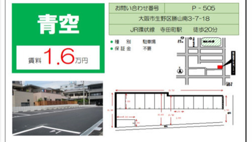 ・月極駐車場(月額18,000円!)🚗〜❗️ (モータープール・パーキング) ・オーナー直接契約のため、仲介手数料0円! (ご利用開始後の対応は、プロの管理会社が行いますのでご安心下さい。) ・管理費、更新料0円!・アスファルト舗装済み! ・夜間用の照明(自動点灯)設置!・防犯カメラ設置!・生野区役所、生野郵便局近く!・住所・・・生野区勝山南3-7-18(勝山南第2大洋パーキング)・車庫証明の承諾書発行可!(別途1万円(税込)費用です。) ・礼金は賃料の1ヵ月分(18,000円)・利用者募集中です。よろしくお願い致します!☎︎090-1710-7659(区画によっては、軽・小型自動車のみとなりますので、ご了承下さいませ。お申込み状況により満車の場合は、ご容赦願います。)#駐車場#駐輪場#モータープール#パーキング#車#自転車#物置#倉庫#荷物#スペース#荷物置き#引越し#大阪#大阪府#大阪市#短期#長期#生野#勝山南#一時#資材置#在庫置#寺田町#桃谷#巽#賃料#家賃#敷金#礼金#保証金#無料#バイク置き場#バイクコンテナ