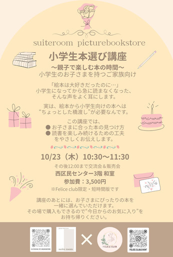 📚✨ 小学生のお子さまを持つご家族の皆さまへ ✨📚「絵本は大好きだったのに、小学生になったら本を全然読まなくなった…」そんな経験はありませんか?実は、絵本から児童書への移行は “自然にスッと進むものではない” のです。いきなり難しい本にジャンプアップしてしまうと、「読めない」「つまらない」と感じ、読む習慣そのものが止まってしまうことも。だからこそ大切なのは 小さなステップアップ。親ができるのは、ほんの少しの工夫と、お子さまに合った本をそっと差し出すこと。それだけで “読書が楽しい!” という気持ちを続けていけます。今回の講座では、✔ プロから学べる移行のコツ✔ おすすめ本の紹介✔ お子さまにぴったりの本の選書体験が一度に体験できます✨講座後は、その場で気に入った本を購入することも可能。お子さまが「今日から読みたい!」と思える一冊を一緒に見つけてあげてください📖【小学生 本選び講座】🗓 10/23(木)10:30~11:30 その後12:00まで交流会&販売会📍 西区民センター3階 和室💰 参加費:3,500円※Felice club限定・短時間版です🌸 お問い合わせ・参加お申し込みは、下記インスタ✨Felice club✨ https://www.instagram.com/felice.club.event?utm_source=ig_web_button_share_sheet&igsh=YzY2N2RxMzBlajJ4✨suiteroom_picturebookstore✨ https://www.instagram.com/suiteroom_picturebookstore?utm_source=ig_web_button_share_sheet&igsh=MWJ4dTcwM3BtaG1sdg==のDMにご連絡くださいませ😊お子さまの状況について、いくつか簡単にお伺いさせて頂きます。ご了承くださいませ🙇♀️Felice club