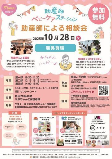 【いよいよ今週!まだ間に合う!参加者募集】助産師ベビーケアーステーション 助産師による相談会 ~赤ちゃんハッピー離乳食編~離乳食に関する講座と、子育てに関する相談会を開催いたします。 助産師への相談及びママ同士の情報交換の時間もあります。開催日: 2025年10月28日(火)時間 :3部制1部 10:30~11:30 / 2部 12:15~13:15 / 3部 14:00~15:00 ※内容はすべて同じです。 ※参加回はご選択いただけます。場 所 :1階 センターコート募集人数 :赤ちゃんと保護者様 各回20組40名対象 :離乳食開始前後から離乳食中の2〜12か月頃の親子様。 保護者様のみのご参加も受付けております。持 ち 物 :おくるみまたはバスタオル(任意)参加方法 :事前予約制 9月12日(金)10:00~10月27日(月) 18:00 ※お申込みは先着順になり、定員に達し次第終了となります。ご応募方法:本プログラムサイトより必要事項を記入の上お申し込みください。お申し込みはこちら。お問い合わせ:mama@joseken.or.jp《当日の注意事項》・託児スペースのご用意はございません。 お子様と参加いただく場合はお子様と一緒にご参加となります。・開始時間の5分前に開催場所に集合をお願いいたします。・社会情勢の変化により臨時休館などが発生した場合、急遽当イベントを終了させていただく場合がございます。予めご了承ください。・画像、イラストは全てイメージです。 ※掲載内容は、予告なく変更する場合がございます。・営業時間、営業内容につきまして。急遽変更させていだく可能性がございます。 ご来館の際にはウェブサイト「お知らせ」ページから最新の営業時間をご確認のうえお越しください。