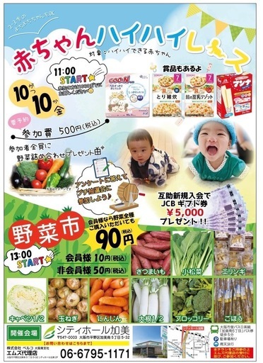 イベントのお知らせです📢10/10👶11:00〜ハイハイ よちよちレース参加費:500円参加者全員にお野菜詰め合わせプレゼント🎁受付:10:30当日、受付にてハイハイ部門とよちよち部門の出場者の振り分けをおこないますので10:30までにお越しください✨⚠️予約まだまだ受付中です!出場希望の方はスタッフまでご連絡ください‼️(野菜)13:00〜毎月恒例 野菜市さつまいも小松菜エリンギキャベツ1/2玉ねぎにんじん大根1/2ブロッコリーごぼん会員様はぜ〜んぶ10円‼️⚠️野菜市は13:00〜になりますのでご注意ください!その他マルシェ、キッチンカーもたくさん出店💕ぜひお越しください☺️