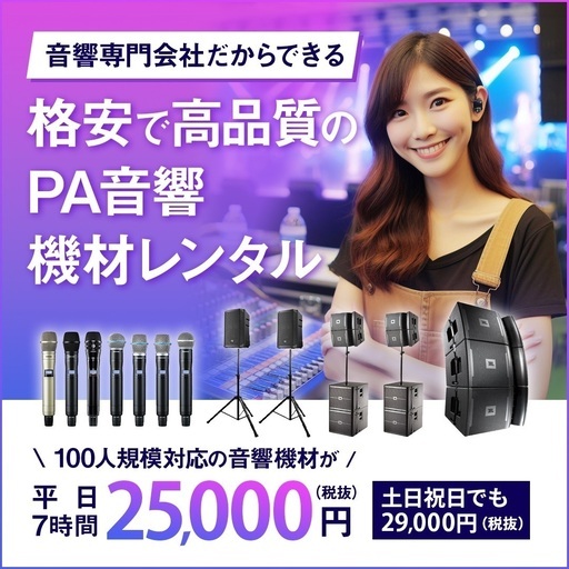 ご観覧ありがとうございます★音響照明機材のレンタルをお探しでしたらPA専門店の大阪、名古屋にお任せください!配信ライブもおまかせ イベントの音響照明、コンサート音響照明、展示会入社式年間:300件以上のイベントを行っております!プロ用の音響機材を格安の価格でレンタルしております。多数のマイクやスピーカー、ステージ照明を在庫しています。[ホームページ] https://rental.abra-inc.com/オペレーター、サウンドエンジニアの派遣もしています。音響や照明のことならお気軽に当社にご相談ください!! https://rental.abra-inc.com/06-6796-7024LINEで問い合わせはコチラ https://lin.ee/5cXD4suスピーカーアンプセット!¥25000〜ミキサーマイクセット!その他アナログターンテーブル、DJミキサー電子ピアノ88鍵、ドラムセット、配信ライブ、マラソン大会、駅伝ギターアンプ、ベースアンプ、GoTo商店街ドライブインシアター、オンライン株主総会、オンライン結婚式カウントダウンイベントエアースクリーン、大型スクリーンワイヤレスマイク、ちょうちんステージ照明、ムービングライト、LEDパーライト、ピンスポットライト京都、奈良、和歌山、大阪、兵庫、滋賀、三重、岡山、広島、徳島