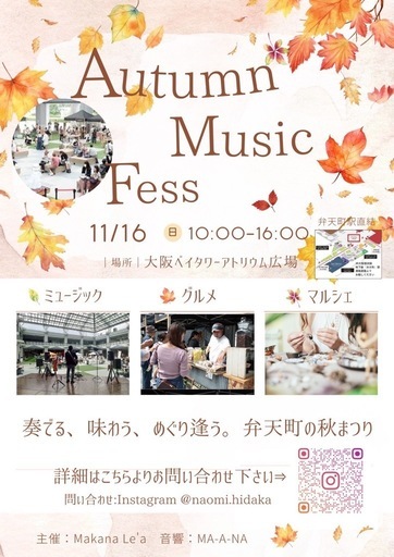 皆さんお待たせしました✨大阪ベイタワーアトリウム広場Automn Music Fess🎶11月16日(日)10:00〜17:00開催決定しました‼️音楽あり、フードあり、マルシェありで盛り上がる事間違い無し❣️☆〜出店者専用〜〜☆◾️出店ブース2×2m 3,000円◾️フードテントブース2,5×2,5m 4,000円※露天営業許可証の画像をノートへ添付下さい。▲駐車場🅿️地下有料テント(必要であれば)持参下さい。*おもり必要。※出店料は前払いとさせて頂きます。※指定の口座にお振込み下さい。※出店内容ご確認後お振込み先口座送らせて頂きます。※お振込みのご確認が取れ次第ご出店確定とさせて頂きます。⚠️お振込み後キャンセルでの返金はできかねますのでご了承■机×イス2脚付き¥500-*但し搬入、搬出は各自で行って下さい。搬入時、倉庫までは案内致します。以上、大変お手数をお掛けしますがご確認どうぞ宜しくお願い致します☺️主催 Makana Le'a 日髙直美音響 MA-A-NA 寺脇篤司