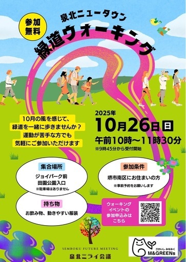 来月、近畿大学病院が移転開院する泉北ニュータウンの泉ヶ丘エリア✨地域交流の場として、今回ウォーキングイベントを開催する事となりました☺️ジョイパーク泉ヶ丘前の田園公園入り口からスタートし、ゴールの大蓮公園を目指して楽しくウォーキングします‼️途中、トイレ休憩をとりつつ秋の緑道、一緒に歩きませんか?普段、全然運動出来ていない方も、毎日歩いている方も大歓迎です。定員は10名。多数の場合には抽選とさせていただきます🙇♂️参加は事前予約制となっています。以下のURLからお申し込みをお願いします😊 https://forms.gle/5z9u9W5wUqarFmJw6