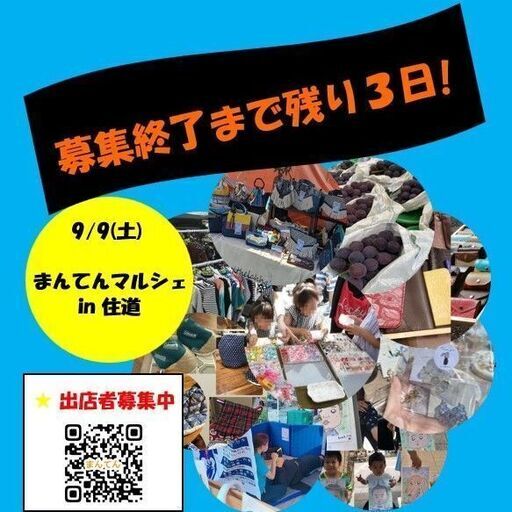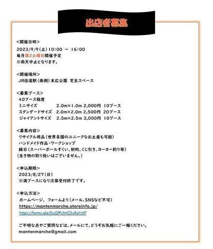 <開催日時> 2023/9/9(土)10:00 ~ 16:00 毎月第2土曜日開催予定 ※雨天中止となります。 <開催場所> JR住道駅(南側)末広公園 芝生スペース <募集ブース> キャンセルの為、残り1ブース スタンダードサイズ 2.0m×1.0m 2,000円 ※テント、テーブル、椅子は出店者様でご用意ください。 <募集内容> リサイクル用品(世界各国のユニークなお土産も可能) ハンドメイド作品・ワークショップ 縁日(スーパーボールすくい、射的、くじ引き、ヨーヨー釣り等) (食品・生き物の取り扱いはございません。) <申込期限> ※満ブースになり次第受付終了です。 <申込方法> ホームページ、フォームより(メール、SNSなど不可) https://mantenmarche.storeinfo.jp/ https://forms.gle/DuQfFLhHZ3uRaYz97 ご不明な点やご質問などは、メールにて、どうぞお気軽にご一報ください。 mantenmarche@gmail.com