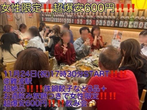 (関西地区街コン最安値‼️600円‼️)【11月24日(祝)17時30分〜難波駅】祝日も超爆安飲み会でお友達・ご縁作り🍖【超絶品‼️‼️鉄鍋餃子、牛すじ旨辛鍋など8品+お酒飲み放題+今回限定‼️超絶品‼️粗品つきで🎁】女性限定‼️‼️超爆安600円‼️‼️(初参加男性先着2名まで1,000円) (投稿ID : 1l254v)