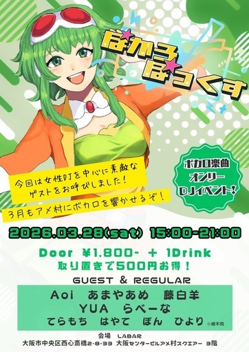 ボカロ楽曲のみが流れるDJイベントです!🔰クラブに行ったことない初心者の方大歓迎🔰みんなでワイワイボカロを聴いて楽しもう✨こんな方におすすめ・ボカロ、歌い手、インターネットが好き・音楽が好きだけど語り合える友達がいない…・みんなでワイワイ盛り上がりたい!・趣味が一緒の友達が欲しい!もちろん一人での参加も問題なし✨ボーカロイドの音楽を聴きながら盛り上がろう!DJイベントに行ったことがなく不安、という方はなんでも質問してください😄✨⭐️イベントの流れ⭐️▶️入場!15:00〜イベント会場についたらまずはドリンクカウンターへ!入場料 ¥1,800- とファーストドリンク(もちろんソフトドリンクでもOK!)を注文!予約(取り置き)をしていただくことで入場料が500円オフ!お得に楽しもう🉐▶️イベントスタート!そのあとはフリータイム!流れるボカロ楽曲を聴きながら自由に過ごそう!音楽に没頭するもよし、お酒を楽しむもOK✨この曲なんてタイトルかな?と思ったらプレイしているDJさんに聴いても問題なし✨途中退出ももちろんオッケーなので、安心して楽しんでね!【注意事項】・18歳未満の入場はお断りしております。・店内で利用できる決済方法は現金、またはpaypayです。・店内での危険な行為、迷惑行為を確認した場合には退店していただく可能性がございます。あらかじめご注意ください。・その他モラルに反する行為、犯罪行為を確認した場合には退店をしていただきます。イベントの雰囲気が気になる方はTikTokアカウントもみてね✨@vocabgpmwms