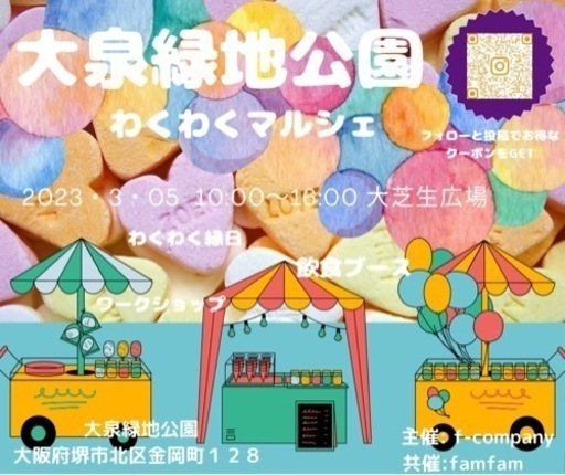 f-companyの田上です。参加者全員で『楽しい』を目指しているマルシェです☆*:.。. o(≧▽≦)o .。.:*☆▶︎大阪を拠点に日本各地での開催を目指している f-companyです。皆さんとお会い出来る日をスタッフ一同、楽しみにしています٩( 'ω' )و▶︎今回は3月5日(日曜日)堺市、大泉緑地公園わくわくマルシェの募集となります\\\\٩( 'ω' )و ////概要はお気軽にお問い合わせ下さいね♪【出店者様募集】キッチンカー、ワークショップ、手荷物ブースなどなど以下の予定で募集をさせていただき【パフォーマー様募集】▶︎ライブ、ダンス、バルーンアート、マジック、ジャグリング、ヒーロー等など、各30分程度(最大1時間)でフェスを盛り上げてくださる方を募集しております。※飛沫飛散が予想される歌唱やトランペットなど管楽器の受付を停止中ジモティのメッセージへ▶︎パフォーマンスの内容▶︎参加形式▶︎年齢をメッセージへお願い致します。キッチンカー、飲食、ハンドメイド作家さんはエントリーは先ずジモティのメッセージで以下をコピペして頂きご利用下さい。▶︎instaアカウント(SNSアカウント)▶︎insta名(SNS名)▶︎出店名▶︎出店希望日▶︎車種▶︎車両ナンバー▶︎フルネーム▶︎自己PR▶︎希望ブースの(企業ブース、飲食ブース、一般ブース、キッチンカー等)▶︎出店内容以上