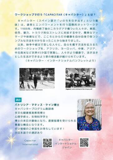 イライラや不安など、付き合いづらい感情をセルフケアするワークショップを箕面で開催します!11/5(水)19時~20時半らいとぴあ21(北大阪急行箕面萱野駅徒歩10分)参加費:300円感情のケアはなかなか大変ですが、指を握ったりタッピングしたりする簡単な方法で行えます。世界47か国で約40年、紛争地被災地などでこころのケアをボディワークで行ってきた国際NGO「キャパシター・インターナショナル」創設者を招いたイベントです。国連機関、カナダや南アフリカなど政府機関とも連携した実績のあるプログラムで、トラウマケアの進む北米では学校教育、医療現場にも取り入れられています。創設者の来日最後の機会となり、大阪にお招きすることになりました。自分のこころをケアしたい人、家族や友人に伝えられるセルフケアを探している方、支援者の方、ぜひ一緒に体験してみませんか