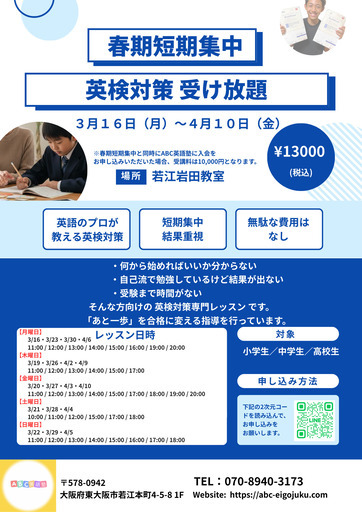 【春休み限定】英検対策 受け放題|短期集中で合格力UP!英検まで時間がない方、「何から始めたらいいか分からない…」「自己流で勉強しているけど結果が出ない…」そんな方のための 春休み短期集中 英検対策講座 です。プロ講師が一人ひとりの弱点を見極め、「あと一歩」を合格に変える指導を行います。■ 講座内容・英検対策 受け放題(期間中何回でもOK)・短期集中/結果重視・無駄な教材費なし■ 期間3月16日(月)〜 4月10日(金)■ 対象小学生/中学生/高校生■ 料金13,000円(税込)※春期短期集中と同時にABC英語塾へご入会の場合 ➡ 受講料 10,000円(税込)■ レッスン日時【月曜日】3/16・3/23・3/30・4/611:00 / 12:00 / 13:00 / 14:00 / 15:00 / 16:00 / 19:00 / 20:00【木曜日】3/19・3/26・4/2・4/911:00 / 12:00 / 13:00 / 14:00 / 15:00 / 17:00【金曜日】3/27・4/3・4/1011:00 / 12:00 / 13:00 / 14:00 / 15:00 /17:00 / 18:00 / 19:00 / 20:00【土曜日】3/21・3/28・4/410:00 / 11:00 / 12:00 / 15:00 / 17:00 / 18:00【日曜日】3/22・3/29・4/511:00 / 12:00 / 13:00 / 14:00 / 15:00 / 16:00 / 17:00 / 18:00■ 場所ABC英語塾 若江岩田教室(大阪府東大阪市若江本町4-5-8 1F)■ お申し込み方法LINEから簡単お申し込み※チラシのQRコードをご利用ください■ お問い合わせTEL:070-8940-3173Website: https://abc-eigojuku.com英検合格を本気で目指したい方、春休みをムダにしたくない方、まずはお気軽にお問い合わせください✨