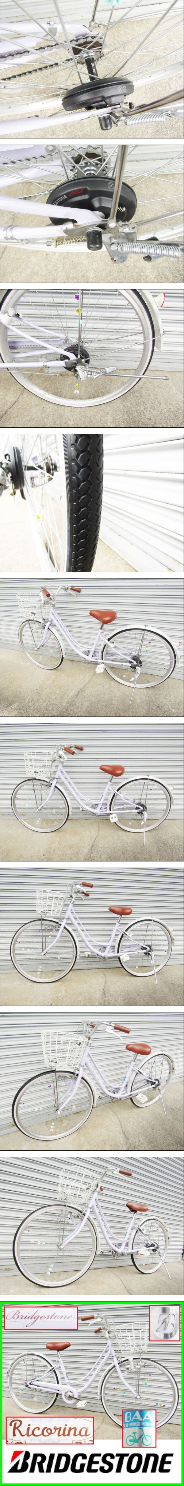 信頼と実績 ブリヂストン BRIDGESTONE 美品 ブリヂストン リコリーナ 26インチ(定価¥48,000-) BRIDGESTONE Ricorina 上品なテイストが素敵な ラベンダーパープルの26インチ自転車♪ ハンドル高さ : 94㎝ ~ 102㎝ サドル高さ : 66cm ~ 83cm 多少よごれは見られますが 状態良くとても綺麗です♪ 通勤・通学・週末ライド・ピクニック どうぞよろしくお願い致します 防犯登録用 販売証明書 付帯しております <a href="https://template.afimg.jp/upfiles/683962/merged2_68fc6d709d8b9.jpg" target=new>クリック→追加画像 ① 30枚←クリック</a> <a href="https://template.afimg.jp/upfiles/683962/merged2_68fc6d8422fcd.jpg" target=new>クリック→追加画像 ② 30枚←クリック</a> <a href="https://template.afimg.jp/upfiles/683962/merged2_68fc6d956bd50.jpg" target=new>クリック→追加画像 ③ 10枚←クリック</a> 取りに来られる方 0円 近所の配達3000円〜5000円 宅配発送は 前輪・ハンドル・ペダル・LEDライト・前かご類外します 簡単 組み立て出来る方ならご発送可能♪ 関東〜九州で7000円 東北地方9000円 北海道11000円 離島地域や沖縄は 後輪も外せば送れます 組み立て大変です ご相談ください