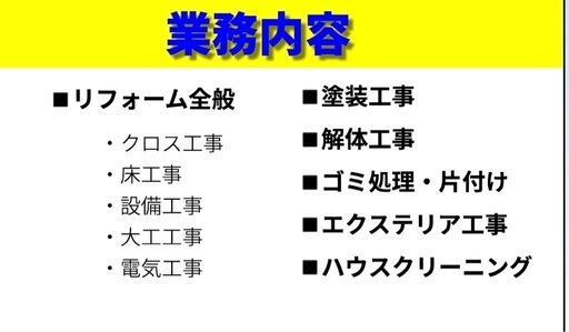 内装工事、家の事なら何でもお問い合わせ下さい。主にリフォーム全般 クロス工事 床工事 設備工事 大工工事 電気工事などを請け負ってます。塗装、解体、ゴミ処理やエクステリア工事、ハウスクリーニングもしております。見積もり無料でさせて頂きますので、是非お見積もりだけでもご連絡ください。また、不動産オーナー様の中古物件リフォームやマンションのリフォーム、原状回復工事なども募集してますので是非宜しくお願いします!!仕事の真面目さ、丁寧さ、はどこにも負けません!!インスタグラム https://www.instagram.com/penginya0120?igsh=MWRqbTZ0Y3J4ODM1ZQ%3D%3D&utm_source=qr施工事例載せてます!