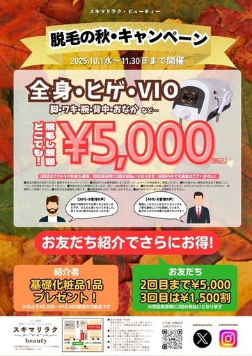 \30〜40代の男性に人気/毎日のヒゲ剃りで肌がヒリヒリ…お風呂屋さんに行くのが恥ずかしい…来年こそはハーフパンツを履きたい…青ヒゲ・ムダ毛が気になるけど、医療脱毛は高い&痛そうで一歩踏み出せない方へ👇👑10月限定キャンペーンヒゲ・VIOを含む全身脱毛が、なんと5,000円で体験できます‼️※2回目までこちらの価格・3回目より通常価格メンズ専用&完全個室なので、周りを気にせず安心◎✅ 肌への負担が少ない光脱毛機を使用✅ 勧誘なし・都度払いOK✅ 仕事帰り・スキマ時間にも通える30〜40代のお客様からは…👇「ヒゲ剃りの回数が減ってラクになった!」「清潔感が出て、職場でも印象が良くなった!」と嬉しい声が続々✨🎁ジモティ投稿を見た方限定で、初回来店時にスキンケアグッズをプレゼント!気になる方は、公式LINEよりお気軽にお問合せください✉️ 公式LINE▶︎ https://lin.ee/8IE2F5Bs⚫︎スキマリラク・ビューティー大阪メトロ『今福鶴見』駅③番出口スグ完全予約制ですので、必ずご予約の上ご来店ください https://sukimabeauty.shopinfo.jp