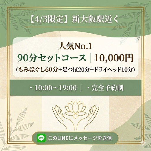 4/3(金)新大阪駅近くのレンタルサロンにてこの日限定で、沖縄から出張施術いたします!人気No.190分セットコース|10,000円(もみほぐし60分+足つぼ20分+ドライヘッド10分)・10:00~19:00|・完全予約制気になる方やお問い合わせはメッセージもしくは、以下からご連絡ください😊🌈Instagram https://www.instagram.com/a.ranju_relaxation?igsh=dWZvNnA2M2Q1ZDF5&utm_source=qr📨公式LINE(ご予約専用) https://lin.ee/VI1XV6e