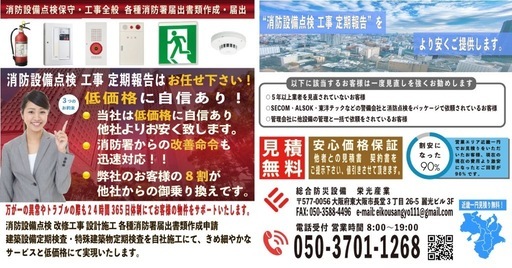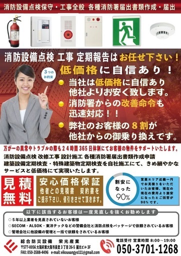 消防設備工事 法定点検 消防署申請 消防署改善通知にも迅速に対応 パッケージ型消火設備 消火器 自動火災報知設備 誘導灯 消火栓 工場 倉庫 事務所 特定小規模自火報設備 民泊 ゲストハウス ディサービス 消防設備法定点検・工事激安価格にてお受け致します。 消防署からの改善命令も迅速対応。 各種消防署届出書類作成届出致します。 消防署申請書類作成 消防署各種書類作成届出 工場 民泊 デイサービス等新設開業工事消防署申請 少量危険物貯蔵所 消防適合通知当社にお任せください。 消防署点検報告も迅速に対応いたします。 安心の消防設備士資格を持ったスタッフがお伺いいたします。 見積もり無料 お電話ください。 TEL 050-3592-9811