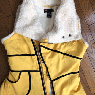 襟元は全部閉めてもいいし、半分開けてもいいし、全部開けて開襟にしてもいいです。表は綿の黄色。中はフリース。前見頃の裾の方にシミがあり。後ろ身頃は若干長くなっています。